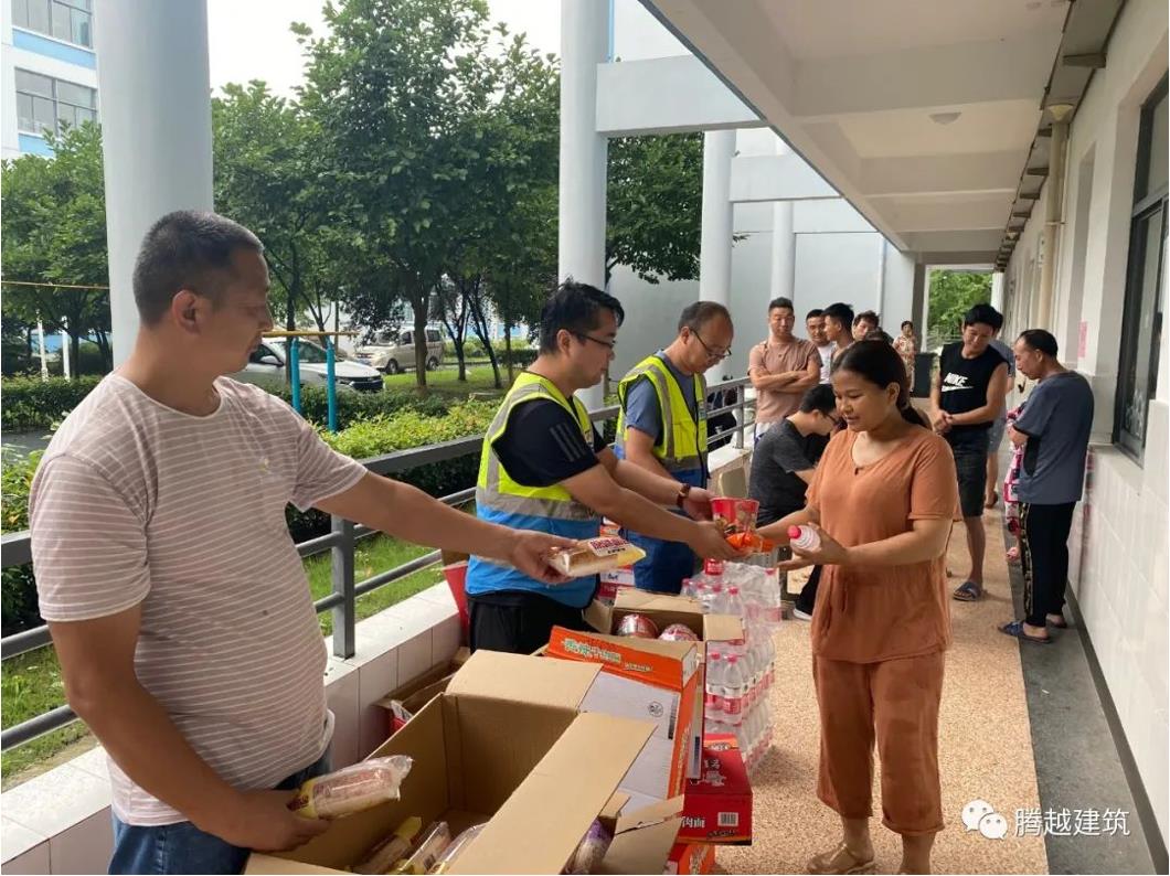 “烟花”台风运动路径复杂、风速大、风力强、影响范围广、持续时间长。腾越建筑浙江公司、江苏公司通过提前做好人员转移和安置工作准备,将涉台的10余个项目人员安全转移至临近的体育馆、学校、酒店等安全区域,累计转移工友人数2881人,并为工友免费派发了1075箱水,超13470份面包、快餐等生活必备物资,确保转移人员的生活必需。同时管理人员轮岗值守安全区域,随时保证群众的安全和需求得到满足。